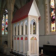 Dorchester Abbey was founded by St. Birinus in AD 635, after having converted the local Saxon king, Cynegils of Wessex to the teachings of the Christian Church. Cynegils gave the saint an old deserted Roman town and its walls made a fine enclave for Birinus' new cathedral. Dorchester was the centre of the See of Wessex until AD 660, when the bishop moved to Winchester. The Mercians took over Dorchester and, after periods with the cathedral in Lindsey and Leicester, the bishop returned to the town in the AD 870s. The church there remained the cathedral of a vast diocese spreading all the way north to Lincolnshire, until just after the Norman Conquest and the present building dates from this time. In 1140, it became a Austuginian Abbey. It was a popular place of pilgrimage in medieval times, despite the fact that Winchester claimed to have appropriated the bones of St. Birinus when the see moved south. The present shrine is a very elegant modern replica based on fragmentary remains. Much of the abbey church survived the Dissolution of the Monasteries to serve the parish, and is famous for its fabulous medieval stained glass (1225+ including a Jesse Tree), its superb effigy of a swaggering knight (possibly Sir John de Holcombe (d.1270) or William de Valance the Younger (d.1282)), its excellent frescoes (1340), its fine brass (1510) to Abbot Bewforest (indents, however, showing that there were once much better examples in the building) and its unusual lead font (1170).